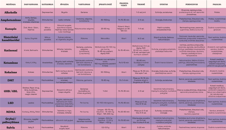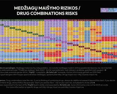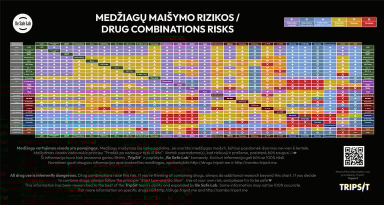 TripSit ir Be Safe Lab paruošta objektyvi informacija apie medžiagų mašymo poveikį. Super naudinga atmintinė priimant sąmoningesnį ir saugesnį sprendimą vartoti
