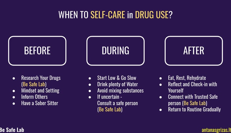 Mano parengta atmintinė kaip tinkamai pasirūpinti savimi prieš, per ir po medžiagų vartojimo, siekiant sumažinti su vartojimu susijusias rizikas.